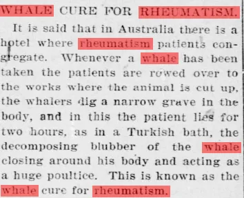 On page 10 of The Pacific, a commercial advertiser for Honolulu, Hawaii, dated April 12th 1899, there is a report on a hotel in Australia where one could go to find help with their rheumatoid arthritis. This treatment, however, was a little...unorthodox. See, whenever a nearby whale would die, patients would then be rowed to the whale, where the whale would be cut up and a narrow cavity would be made in its body. The patient would then enter the carcass and lay down for around two hours. This process, allegedly, relieved soreness and inflammation, thus helping ease the pain from the aforementioned disease. It's worth noting, however, that the treatment was reported to have been discovered by a drunken man, staggering along the beach near the whaling station of Twofold Bay, and who, upon seeing a dead whale cut open, took a header into the decomposing blubber. Considering how Australians love to just lie about things for the fun of it, I'd take this one with a big grain of salt.